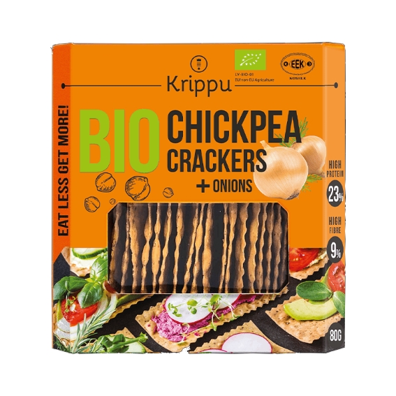 “Krippu” chickpea crackers with onion have a pleasant onion taste, complemented by a rich spice bouquet. Onion crackers contain 23% protein and 9% fibre. In addition – after eating “Krippu” onion crackers, you won’t smell like an onion yourself!