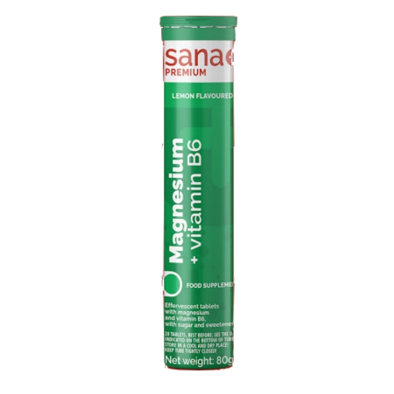 Lemon Flavoured effervescent tablets with magnesium and Vitamin B6, with sugar and sweetener.